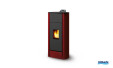 Sa forme arrondie permet de l’installer dans l’angle d’une pièce. La structure est en acier avec un revêtement en métal que l’on trouve dans trois coloris : blanc, anthracite et bordeaux. Le poêle possède une porte en vitrocéramique (800°C) avec un système autonettoyant, un grand tiroir à cendres et un système de charge des pellets en écluse permettant d’utiliser une dose très précise de granulés pour optimiser la consommation.