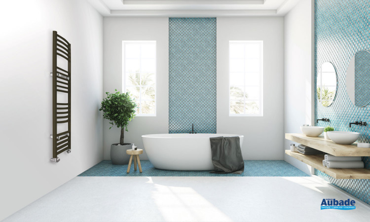 Le sèche-serviettes Tahiti Family affiche un look convivial et original avec une alternance de tubes ronds droits et cintrés qui augmente la surface d’étendage.