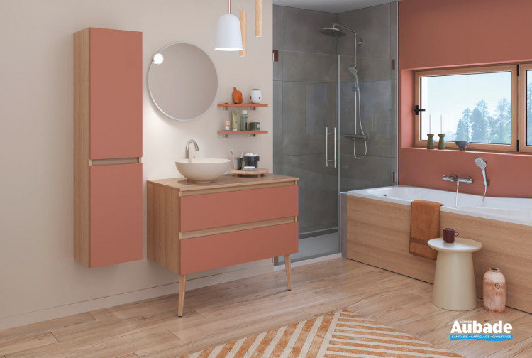 Disponible en L. 80, 100 et 120 cm vasque à gauche ou à droite, L. 120 et 140 cm double vasque.