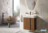 Plan vasque en céramique Blanc brillant. Vide sanitaire à découper. Corps de meuble et façade finition mélaminé toujours assortis. Portes à fermeture amortie.