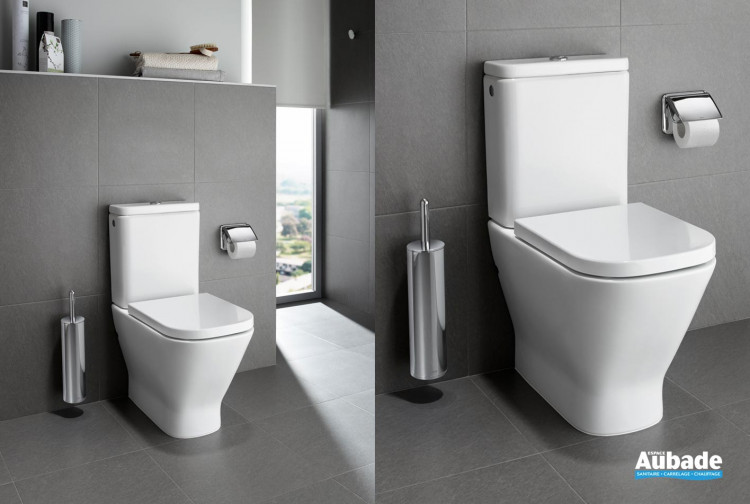 Pack WC compact Rimless avec cuvette sur pied à évacuation duale, réservoir 3/6 litres alimentation latérale et abattant double laqué à retombée amortie.